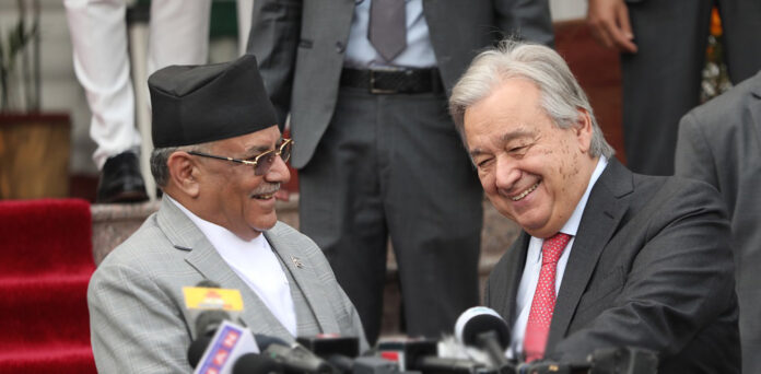 काठमाडौं- प्रधानमन्त्री पुष्पकमल दाहालले संयुक्त राष्ट्र संघका महासचिव एन्टोनियो गुटेरेसको भ्रमणले नेपालको शान्ति प्रक्रियालाई टुंगोमा पुर्याउन महत्वपूर्ण भूमिका हुने बताएका छन् । आइतबार सिंहदरबारस्थित कार्यकक्षमा संयुक्त राष्ट्र संघका महासचिव एन्टोनियो गुटेरेससँगको भेटपछि उनले सञ्चारकर्मीमाझ सो प्रतिक्रिया दिएका हुन् ।