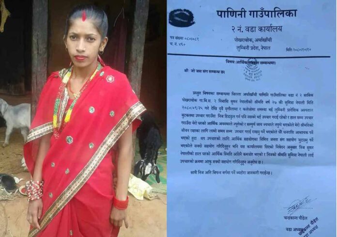 अर्घाखाँची । अर्घाखाँची जिल्ला पाणिनी गाउँपालिका वडा नं. २ निवासी सुमन नेपालीको श्रीमती वर्ष २७ की सुमित्रा नेपाली हस्पीटलको बेडबाट सहयोगको अपिल गर्दै ज्यान बचाईदिन आग्रह गरेकी छिन् । निज बिरामी सुमीत्रा नेपालीको दुवै मृगौला र कलेजोमा समस्यामा भई लुम्बिनी प्रादेशिक अस्पताल बुटबलमा उपचार गराउँदै छिन् ।