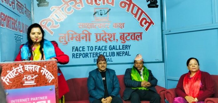 कार्यक्रम रिपोर्टस क्लब नेपाल लुम्बिनी प्रदेश अध्यक्ष रामकुमार क्षेत्रीको अध्यक्षतामा भएको कार्यक्रममा पत्रकार महासंघ लु्म्बिनी प्रदेश उपाध्यक्ष मिना ढकाललाई सम्मान गरिएको थियो ।