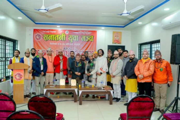 तिलोतमा । पौष २६, वैदिक सनातन धर्मका अनुयायी युवा एवं धार्मिक अभियन्ताहरूले सनातन धर्म रक्षाको निमित्त सबै एकीकृत भएर लाग्नुपर्नेमा जोड दिएका छन् । पौष २५ गते रूपन्देहीको तिलोत्तमास्थित वनवाटिकामा सम्पन्न भएको सनातनी युवा मञ्चको प्रथम वार्षिक उत्सवमा युवाहरूले समाजमा आध्यात्मिक चेतना जगेर्ना गर्न युवाहरू जाग्नुपर्ने आवश्यकता महसुस गरेका हुन्। मञ्चका अध्यक्ष प्रेमसुजन शास्त्रीको अध्यक्षतामा सुरु भएको कार्यक्रममा प्रमुख अतिथि सरस्वती संस्कृत विद्यापीठका प्राचार्य बालकृष्ण पाठकले सम्पूर्ण वेदपुराण श्रुतिस्मृतिको सार गीता भएको बताउँदै गीताको सार समग्र लोकको कल्याणका निमित्त परिभाषित हुने गरी बुझाउनुपर्नेमा जोड दिनुभएको थियो ।