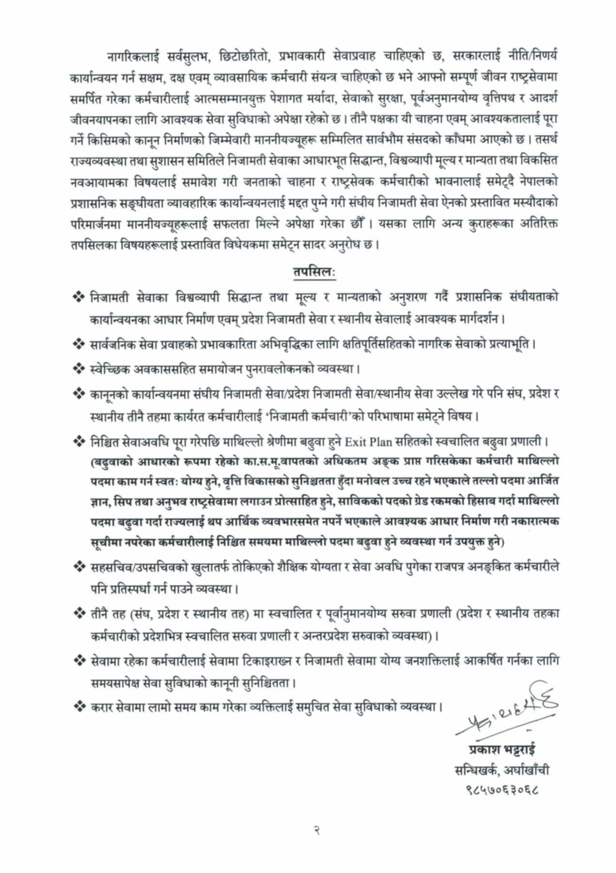 प्रस्तावित ऐनले निजामती सेवाका विश्वव्यापी सिद्धान्त तथा मूल्य र मान्यताको अनुशरण गर्दै प्रशासनिक संघीयताको कार्यान्वयनका आधार निर्माण एवम् प्रदेश निजामती सेवा र स्थानीय सेवालाई आवश्यक मार्गदर्शन गर्नुपर्ने, सार्वजनिक सेवा प्रवाहको प्रभावकारिता अभिवृद्धिका लागि क्षतिपूर्तिसहितको नागरिक सेवाको प्रत्याभूति दिलाउनु पर्न, स्वेच्छिक अवकाससहित समायोजन पुनरावलोकनको व्यवस्था गर्नुपर्ने, कानूनको कार्यान्वयनमा संघीय निजामती सेवा/प्रदेश निजामती सेवा/स्थानीय सेवा उल्लेख गरे पनि संघ, प्रदेश र स्थानीय तीनै तहमा कार्यरत कर्मचारीलाई ‘निजामती कर्मचारी’को परिभाषामा समेट्नु पर्ने, निश्चित सेवाअवधि पूरा गरेपछि माथिल्लो श्रेणीमा बढुवा हुने Exit Plan सहितको स्वचालित बढुवा प्रणालीको व्यवस्था गर्नपर्ने, तीनै तह (संघ, प्रदेश र स्थानीय तह) मा स्वचालित र पूर्वानुमानयोग्य सरुवा प्रणाली (प्रदेश र स्थानीय तहका कर्मचारीको प्रदेशभित्र स्वचालित सरुवा प्रणाली र अन्तरप्रदेश सरुवाको व्यवस्था) गर्नुपर्ने, करार सेवामा लामो समय काम गरेका व्यक्तिलाई समुचित सेवा सुविधाको व्यवस्था गर्नुपर्ने सुझाव दिएका छन ।