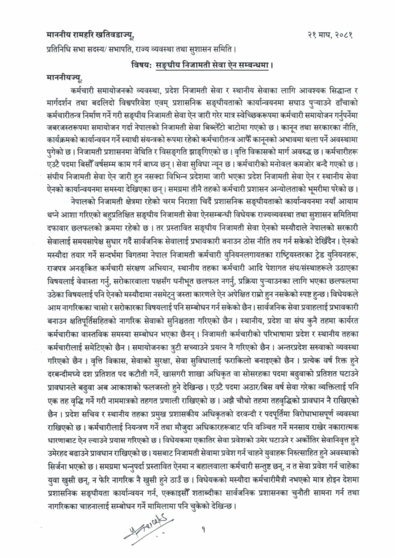 काठमाडौै । संघीय निजामती सेवा ऐनको मस्यौदा संसदको राज्य व्यवस्था तथा सुशासन समितिमा छलफल चलिरहेका वेला नेपाल निजामती कर्मचारी युनियनका केन्द्रीय सचिव समेत रहेका प्रकाश भट्टराईले समितिका सभापति तथा सदस्यहरुलाई पत्र लेख्दै विभिन्न विषयमा ध्यानाकर्षण गराएका छन् । उनले नेपालको निजामती सेवामा रहेका समस्या, तीनै तहका कर्मचारीले भोग्नु परेका कठिनाई, ऐनमा समेटनु पर्ने कुराहरु लगायतका विषय समेटेर समितिका सबै सदस्यलाई छुट्टाछुट्टै पत्र लेखेका हुन ।
